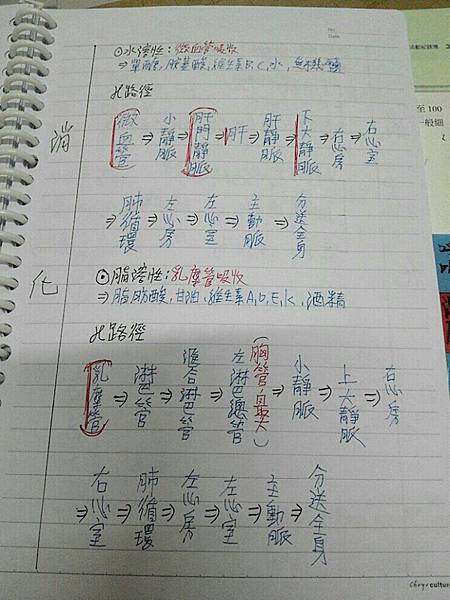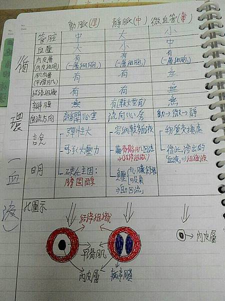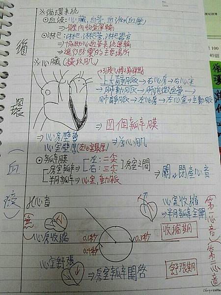 第一張來看看血液循環,小編覺得這頁筆記美中不足的地方是心臟圖的部分可以用紅筆、藍筆繪製血液流動方向